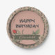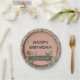 Rosa vermelha e folhas num arco verde-oliva. O fundo é cor-de-rosa e as bordas da placa são decoradas com folhas