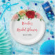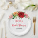 Este prato lindo e elegante apresenta rosas vermelhas, rosadas e laranjas em aquarela com folhagens. O texto combina fontes manuscritas e serifadas para um visual moderno e sofisticado. É perfeito para um chá de noiva rústico de verão.