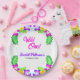Esta elegante placa de papel de aniversário tropical é perfeita para uma moderna festa de aniversário de verão. O simples design apresenta flores amarelas, roxas e magenta floridas com tipografia colorida elegante sobre fundo branco.