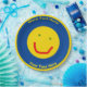 Um sol amarelo de olhos verdes sorrindo sobre um fundo azul. Há dois lugares para adicionar seu próprio texto. Você pode alterar a cor do plano de fundo, bem como a cor do texto e da borda circular.