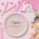 Crie seus próprios pratos de papel redondos e minimalistas para festa de bridal shower.