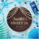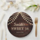 Doces 16 placas de papel de festa de aniversário personalizadas com um fundo de madeira marrom-escuro rústico e luzes de cordas cintilantes. Personalizada com o nome da convidada de honra e a data do seu partido.