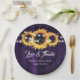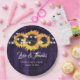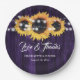 Rustic purple and sunflower wedding paper plates featuring sunflower flowers and string lights on a rustic wood background. Matching items available.