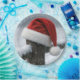 A charming furry Santa Claus hat resting on a rustic fence post, beautifully set against the backdrop of a swirling snowstorm