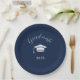 Monte uma mesa sofisticada para sua celebração com o Prato de Papel de Formatura Orioon Editorial Script. Esse essencial de festa de alta qualidade apresenta um fundo azul-marinho profundo combinado com nosso "graduado" característico, um ícone minimalista de birrete de graduação e o ano da turma "2026" em uma fonte serifada limpa e atemporal.