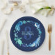 Um prato de festas para uma comemoração sob o mar com criaturas pintadas manualmente do mar, como baleias, cavalos do mar, raias de picada, água-viva, caranguejos, tartarugas do mar e mais sobre um fundo azul-marinho escuro! Você pode personalizar o nome e a idade. Consulte a coleção de partes correspondentes.