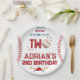 Prontos para uma festa de aniversário desportiva legal? Este design apresenta um fundo branco clássico, pintado à mão, texto azul e vermelho marinho, um beisebol, estrelas, um capacete com ilustrações de taco e bola, "Atingindo o grande", e a tipografia "Swing over". Localizar itens correspondentes no meu compro.