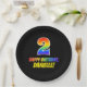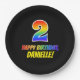 Este divertido, colorido e animado design de placa de papel com tema de aniversário apresenta um grande número "2" e a mensagem "FELIZ ANIVERSÁRIO", ambos coloridos com um padrão inspirado no gradiente do espectro do arco-íris, juntamente com um nome ousado e amarelo personalizável. Tem um fundo de cor preta. Chapas de papel divertidas e editáveis como esta podem ser usadas em uma festa de aniversário sendo realizada para celebrar o segundo aniversário de alguém. [~Z0000488]