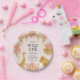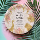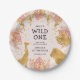 Estas placas de papel de primeira festa de aniversário "selvagem" de safari na selva apresentam folhas falsas de ouro (girafa, leão e macacos), folhagem dourada e rosa da selva, e uma espumante de confete de ouro sobre fundo rosa pálido. Adicione o nome da aniversariante e outro texto a preto.