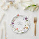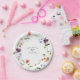 Uma bela placa de festa de aniversário floral para comemorar um 90 no estilo feminino. Uma coroa floral floral de flores silvestres moderna circunda o seu texto personalizado sobre este guardanapo que inclui flores silvestres pintadas em tons de rosa, roxo, pêssego, azul e branco com verde esparso. Personalize o modelo de texto com o nome de convidado de honra. Você também pode mudar a idade se precisar desse design para uma idade diferente. Essas placas estão disponíveis em 2 tamanhos; mostradas aqui no tamanho de 7 polegadas de diâmetro, elas também estão disponíveis em um tamanho de 9 polegadas.