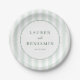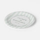 This elegant wedding plate features a minimalist design with vertical light green stripes on a soft background, creating a subtle yet sophisticated pattern. The central circular frame highlights customizable text in a classic serif font, perfect for personalizing with names and dates. The muted color palette of pale greens and whites conveys a serene and refined mood, ideal for formal occasions like weddings. With its clean lines and contemporary style, this plate is both functional and aesthetically pleasing, making it a beautiful addition to any celebration table setting.