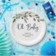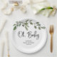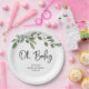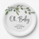 Esses lindos pratos de papel minimalistas para chá de bebê com tema neutro apresentam folhas verdes botânicas simples em aquarela em um fundo branco limpo. A tipografia preta moderna e trendy diz "oh bebê" e adiciona um toque extra de estilo moderno.