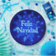 Um enxame de flocos de neve fractais azuis. O texto em espanhol, que lê "Feliz Navidad", aparece em azul e branco brilhantes.