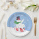 Um boneco de neve se senta sobre um disco de hortelã-pimenta enquanto desliza para baixo numa colina de neve. Ilustração original de Noël Snow.