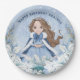 Este adorável prato de papel princesa de inverno de neve apresenta uma bela princesa jovem com cabelos castanhos vestindo um vestido azul e branco com flocos de neve e capa quente com pelo. A princesa está cercada por poinsettias. Você pode personalizar com o nome especial da princesa de aniversário!