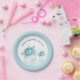 Chapas personalizadas e bonitas para o seu chá de fraldas sob o mar apresentam uma borda azul bebê, com minha mão única pintada de cor d'água, tartaruga marinha e coral no centro. Personalize com o nome da futura mãe e a data do chá. Perfeito como decoração de chá de fraldas, para dar um gole e ver, a festa de aniversário ou a festa de piscina de uma criança. Itens correspondentes disponíveis em www.zazzle.com/vginvites!