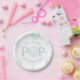 Placas de papel de chá de fraldas com ilustração de bolhas incorporadas ao texto "Ela está prestes a POP" Personalize o nome.