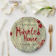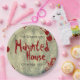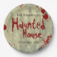 Estes pratos de festas de Halloween assustadores e personalizados apresentam um tema assassino sangrento. O fundo apresenta um padrão de parede de concreto gelado com gotas de sangue espalhadas sobre ele. As manchas de sangue aparecem principalmente nos cantos, com gotas aleatórias de sangue acentuando a área de texto. A frase "Casa Assombrada" é impressa em uma fonte sinistra com uma cor vermelha que corresponde ao derramamento de sangue. Um nome de família de exemplo é impresso no topo com uma data de evento na parte inferior. Você pode personalizar as placas para incluir seu próprio nome e texto personalizado.