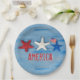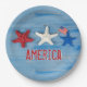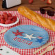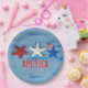 Starfish e a bandeira americana na madeira azul rustica para festa de férias.