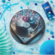 Uma exibição vibrante mostra uma mesa giratória com notas musicais brilhantes e coloridas emanadas do disco giratório