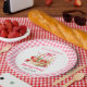 Basket with strawberries, hearts and pink bow Berry First Birthday paper plates. These 'Berry First Birthday' paper plates present a delightful scene: an overflowing basket bursting with vibrant red strawberries. The design is sweetly enhanced by whimsical hearts and a delicate pink bow tied to the basket's handle. The 'Berry First Birthday' text is prominently displayed below, all encased within a crisp white square frame and finished with a bold hot pink and white gingham border.