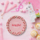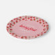 Diversão das placas de papel de festa de aniversário "primeira" de baga. Apresenta um padrão de morango na moda, vermelho sobre fundo cor-de-rosa com fonte contrastante, com um toque de retrorreflector.
