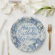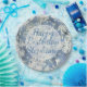 Altere facilmente a mensagem de aniversário usando o modelo de texto fornecido. Essa é a natureza, abstrato fotografia de geada congelada sobre fundo metálico azul com efeito bokeh entre os flocos brancos. Esta fotografia de macro de inverno congelada será um design único para todas as ocasiões; basta mudar o texto para corresponder ao evento.