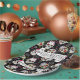 Um design de placa de papel colorido para o Dia das Festividades Mortas, com uma variedade de crânios decorativos de açúcar com sotaques de flores e espirais sobre um fundo preto opcional. Se preferido, o banner e a camada de texto 'Feliz Dia de los Muertos' fornecidos podem ser excluídos para usar este design para outras ocasiões. Procure ID725 para ver outras opções de cores e produtos com este padrão divertido.