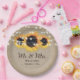Placas personalizadas de brunha rústica e de papel de girassol com flores de girassol e luzes de cordas em fundo de burlap. Itens correspondentes disponíveis para complementar estas placas florais de papel de casamento rústico. Personalizar facilmente para qualquer ocasião.