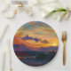 Um design de arte de um belo pôr do sol também mostrando rochas, praia e um homem pescando.