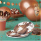 Pratos de papel com desenho de tábuas de madeira escura rústica e silhueta de mapa mundi branco! Bons para um casamento rústico com tema de viagem ou qualquer festa!