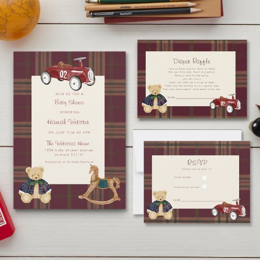 Host a memorable baby shower with these rustic paper plates adorned with a timeless tartan plaid. A beautifully illustrated rocking horse takes center stage, bringing a vintage charm to your event decor. These plates are ideal for creating a warm and inviting atmosphere for a baby boy or baby girl shower. Let these unique plates be a part of your joyous celebration as you welcome your new baby.