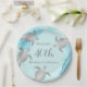 Este elegante prato de papel para um aniversário na praia mostra tartarugas prateadas em um fundo azul-turquesa e um texto personalizado em um roteiro elegante.