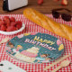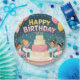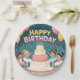 Aniversário feliz com balões e bailarinas, bolo e confetes.