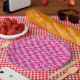 Esta placa de papel do partido caracteriza quadrados em máscaras diferentes do rosa em um teste padrão pixelated que assemelha-se a 16 gráficos do bocado no video games popular.