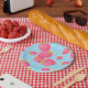 Esta fruta ilustrada alegre encantador das características de design da morango em um fundo azul.