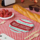 Belas placas de papel com padrão vermelho/aqua e texto personalizável.