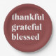Set your fall table with style and gratitude using these Thankful Grateful Blessed Paper Plates, featuring elegant ivory serif lettering on a warm terracotta background.
