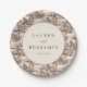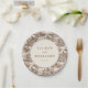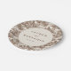 This elegant wedding plate features a vintage-inspired design with a sepia-toned pastoral landscape, showcasing intricate illustrations of houses and trees in muted browns and beiges. The central circular element highlights customizable text in bold serif fonts, surrounded by a seamless pattern that evokes timeless charm and sophistication. Perfect for adding a touch of classic elegance to your wedding celebration, this plate combines detailed artistry with a warm, earthy palette to create an inviting atmosphere.