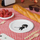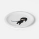 Ninja de desenho animado, bonito mas zangado, vestido de preto, está segurando uma tradicional espada japonesa de katana.