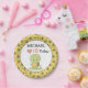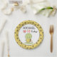 Bela tartaruga de cartoon segurando um balão de coração rosa. Ele tem uma cabeça e pernas verdes, um corpo amarelo, uma concha marrom e um rosto adorável. Ao seu lado está uma pequena flor amarela feliz. A borda é amarela com um padrão de abelha. Modelos para adicionar o nome e a idade do aniversário.