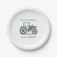 Chapas de papel de aniversário com ilustração de um trator de fazenda verde e cinza em estilo cartoon. Você pode personalizar textos e usá-los para qualquer outra festa como a festa do campo, casamento, aposentadoria, festa de solteira, festa no quintal, festa de vizinhos, recepção de verão etc.