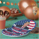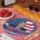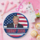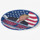 O Partido Trump 2024 Plates Donald Trump com a bandeira americana atrás dele, Trump 2024 esboçado em branco na parte inferior. Chapa de borda azul.