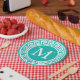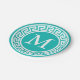 Um fundo turquesa brilhante emparelhado com uma borda chave grega redonda para o seu monograma. Você pode personalizar o estilo e o tamanho da fonte. Crie suas próprias placas de papel para seu evento especial.