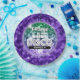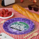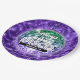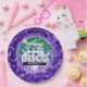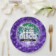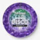 Pratos de papel para a Última Festa de Despedida de Solteira Disco perfeitos para festas de despedida de solteira com tema disco, apresentam fundo com brilho roxo e bola de espelho disco roxa e azul turquesa. Personalize com o nome da noiva e a cidade da sua última festa disco.