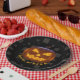 Mau Pumpkin Plate Aproveite A Sua Última Refeição Em Mim Laranja Cinza Negra. Chapa de papel do Dia das Bruxas, assustadora e sorridente. Qual será a sua refeição final neste Halloween?