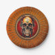 Um crânio cuja presença inspira admiração e fascínio. Seu crânio é marcado pelo tempo, carregando um tesouro radiante em seu centro, uma pedra preciosa que pulsa com cores brilhantes e guarda o segredo da vida e da morte. As tomadas oculares do crânio brilham como dois carvões brilhantes, vermelho vivo e perfurando, como se eles pudessem ver os segredos mais profundos da alma. Uma coroa de folhas de filigre, cujas veias verdes contrastam com o osso pálido. Este abraço vivo simboliza o eterno ciclo da vida e da morte, enquanto uma cadeia articamente trabalhada a rodeia - um sinal da ligação inseparável entre os mundos.