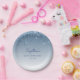 Estas placas de papel chic, elegante, da 60ª festa de aniversário apresentam uma borda brilhante azul esparsa e borda azul ombre e fundo azul. Personalize-os com o nome da convidada de honra em um guião azul de escrita manual, com seu aniversário e data abaixo na fonte sans serif.