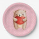Chapas de papel com uma ilustração de aquarela fofa. Um ursinho castanho carregando um grande coração vermelho. Bolinhas amarelas claras em fundo rosa.