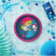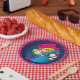 Placas de festa do templo ocidental com uma vaqueira andando de cavalo pau sobre fundo azul com caimento de bandana rosa. Veja este e outros designs semelhantes em outros suprimentos de terceiros na Loja de Dias de Rodeio.